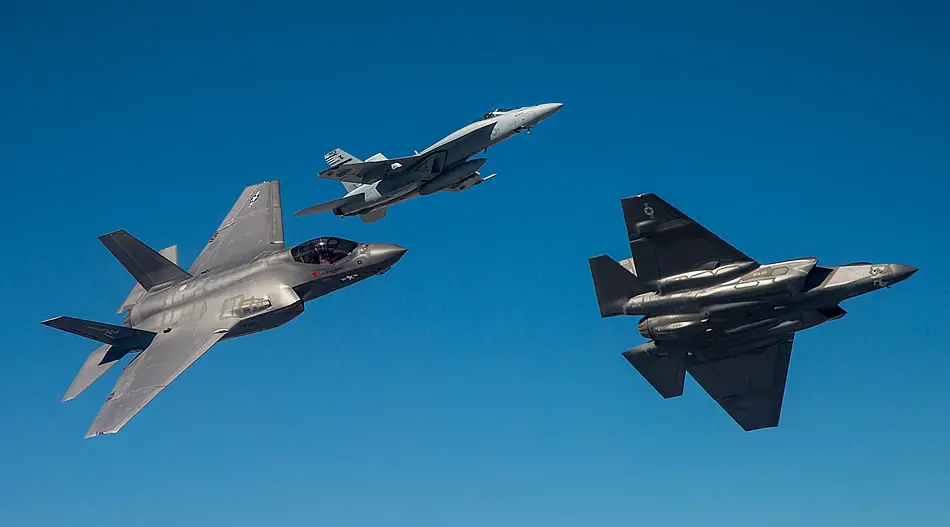 LEMOORE, Calif. (April 14, 2015) Two F-35C Lightning II aircraft before a break maneuver with an F/A-18E Super Hornet from Naval Air Station (NAS) Lemoore. The flight is part of a six-day visit by the Grim Reapers of Strike Fighter Squadron (VFA) 101 to NAS Lemoore, the future basing site for the F-35C. The F-35C will complement the capabilities of the F/A-18E/F Super Hornet, which currently serves as the Navy's premier strike fighter. (U.S. Navy photo by Lt. Cmdr. Darin Russell)