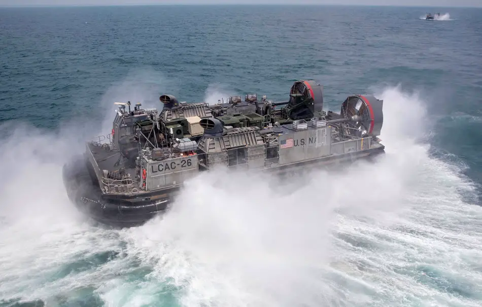 ATLANTIC OCEAN (Aug. 5, 2015) A landing craft air cushion (LCAC) transfers Marines and their equipment off of the amphibious assault ship USS Kearsarge (LHD 3). The Kearsarge Amphibious Ready Group and the 26th Marine Expeditionary Unit (26th MEU) are conducting a composite training unit exercise in preparation for an upcoming deployment. (U.S. Navy photo by Mass Communication Specialist Seaman Apprentice Ryre Arciaga)
