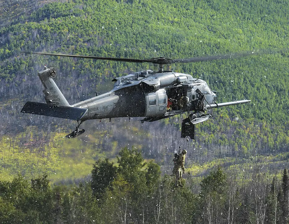 An HH-60G Pave Hawk assigned to the 210th Rescue Squadron at Joint Base Elmendorf-Richardson, Alaska, hovers as Airmen perform a rescue demonstration during Red Flag-Alaska 15-3 Aug. 17, 2015, at the Joint Pacific Alaska Range Complex. The demonstration was for the Executive Observer Program, which is designed to present Pacific Air Force’s premier multinational large force employment exercise while building partnerships with senior airpower leaders from the global community. (U.S. Air Force photo/Senior Airman Ashley Nicole Taylor)