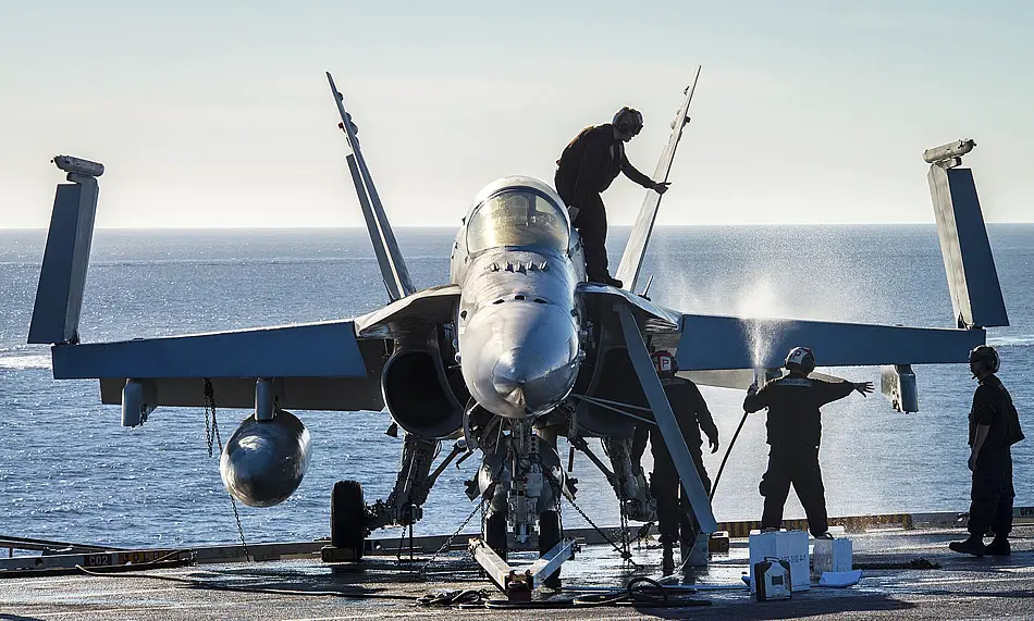 Sailors wash an F/A-18E Super Hornet on the flight deck of the aircraft carrier USS Carl Vinson in the Pacific Ocean, Nov. 4, 2016. The aircraft is assigned to Strike Fighter Squadron 137. Navy photo by Petty Officer 3rd Class Sean M. Castellano