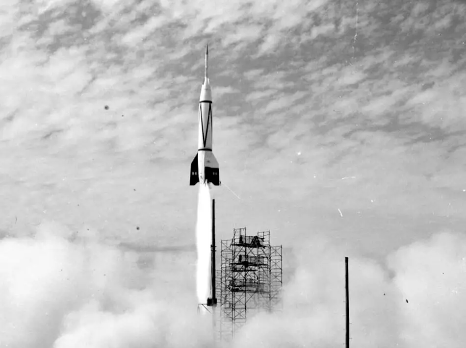 Liftoff of "Bumper 8," a research rocket using a V-2 as a first stage, July 24, 1950. (U.S. Air Force photo)