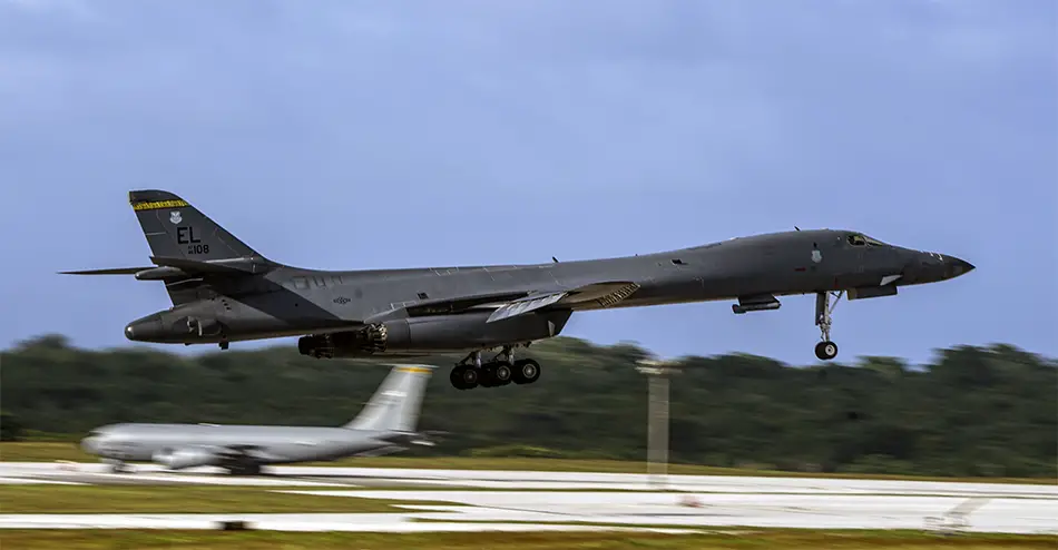 A U.S. Air Force B-1B Lancer, assigned to the 37th Expeditionary Bomb Squadron, deployed from Ellsworth Air Force Base (AFB), South Dakota, lands at Andersen AFB, Guam, Dec. 4, 2017. Two U.S. Air Force B-1B bombers conducted a continuous bomber presence (CBP) mission on return to Andersen Air Force Base, Guam, from Royal Australian Air Force (RAAF) Base Amberley, Australia, where they have been since late November supporting U.S. Pacific Command's Enhanced Air Cooperation initiative. (U.S. Air Force photo/Tech. Sgt. Richard P. Ebensberger)