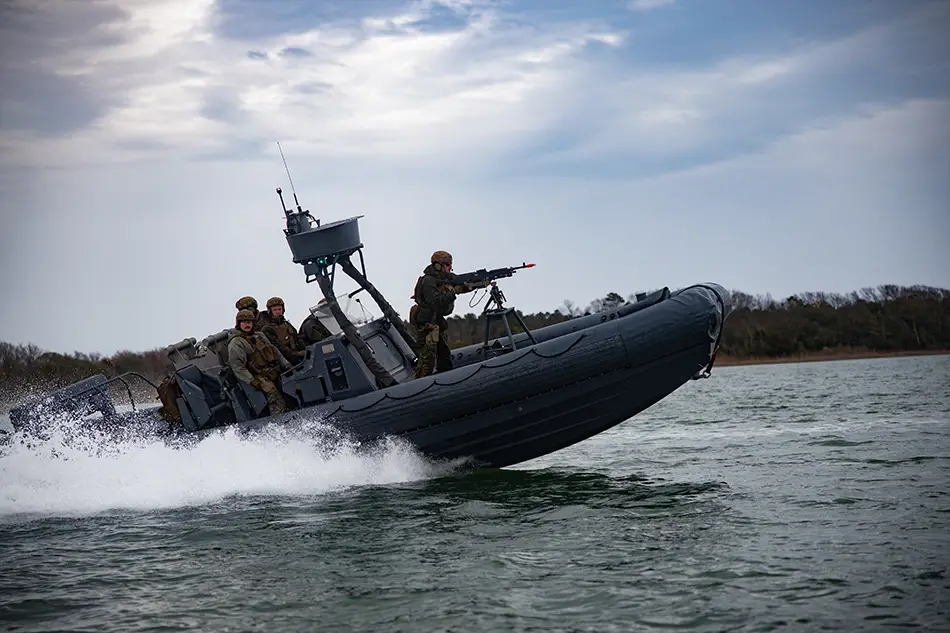 U.S. Marines with Charlie Company, Battalion Landing Team (BLT) 1/6, 26th Marine Expeditionary Unit (MEU), patrol the intercoastal while conducting a littoral movement during MEU Exercise III on Camp Lejeune, North Carolina, March 10, 2023. BLT 1/6 continues to enhance rigid-hulled inflatable boat (RHIB) familiarization and readiness through conducting on and off and shore-to-shore drills prior to deployment.(U.S. Marine Corps photo by Cpl. Aziza Kamuhanda)